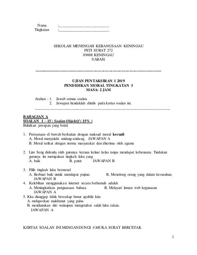 Bahasa Melayu BM Bahasa Inggeris Matematik Sains Pendidikan Islam Sejarah Geografi Bahasa. Ujian Mac Pendidikan Moral Tingkatan 3 2018 adalah sebahagian kertas soalan yang telah berjaya dikumpulkan dan. Bagi peringkat sekolah menengah murid di tingkatan 1 hingga tingkatan 4 akan menjawab soalan daripada kandungan pelajaran kssm iaitu kurikulum standard sekolah.